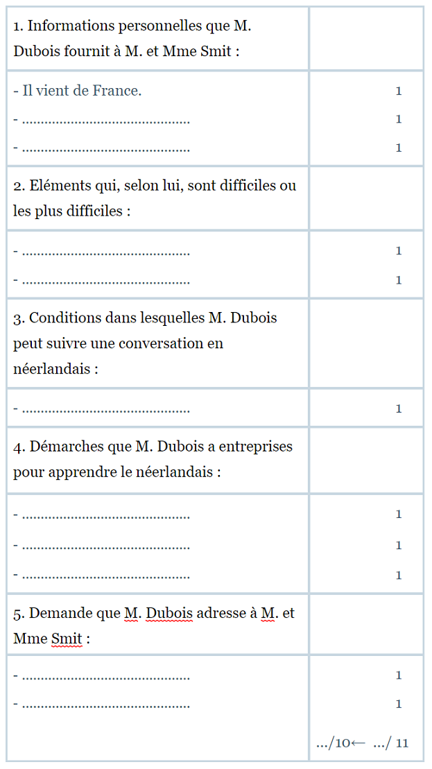 Tu suis, depuis quelque temps, un cours de néerlandais par correspondance et ton professeur à distance t’envoie régulièrement des dialogues en format MP3 que tu dois écouter. Tu viens de recevoir, dans ta boîte mail, un exercice d'audition, accompagné d’une fiche de compréhension : il s'agit cette fois-ci d'une conversation entre M. Smit, M. Dubois et Madame Smit. Tu es prié de compléter la fiche (modèle 1, 2 ou 3) et de la renvoyer à ton professeur dans une quinzaine de jours.